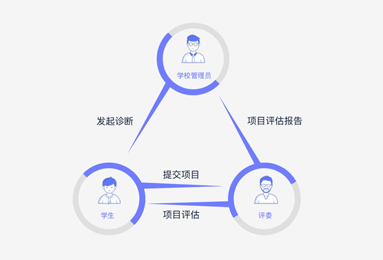 通過線上環(huán)節(jié)完成項(xiàng)目預(yù)診與診斷評(píng)估兩個(gè)階段。評(píng)估主要由學(xué)校管理員-學(xué)生-評(píng)委三個(gè)角色完成。